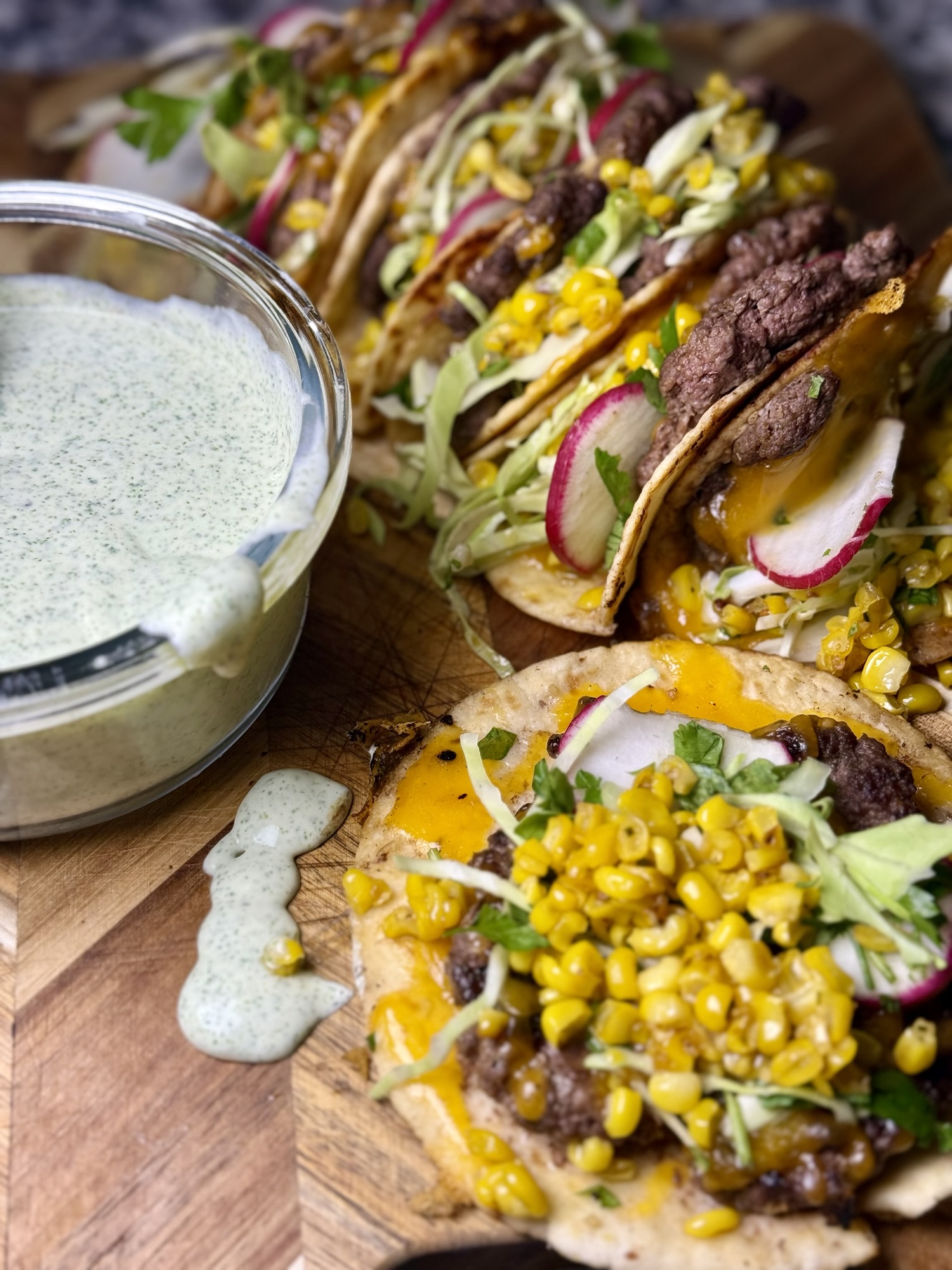 Prep the toppings: Mix shredded cabbage, radish slices, parsley, and cilantro in a bowl. Set aside. Make the cilantro-lime crema: In a food processor or blender, combine crema, lime juice, cilantro, and a pinch of Cowboy Butter seasoning. Blend until smooth. Adjust lime or seasoning to taste. Keep chilled. Cook the cowboy corn: In a skillet, melt butter. Add corn and a little Cowboy Butter seasoning. Cook 3–4 minutes until golden and caramelized. Remove and set aside. Smash the beef into tortillas: Heat a skillet or griddle on high. Roll beef into small golf-ball sized portions. Place one beef ball on the hot skillet, then immediately lay a tortilla on top. Using something flat (spatula, press, or your paper bowl hack), press down firmly to smash the beef into the tortilla. Season the beef side with Cowboy Butter seasoning. Cook until edges are crispy, then flip so the tortilla is now on the bottom. Add the cheese: Sprinkle shredded cheese over the beef. Cover the pan for a minute if needed so it melts. Build the tacos: Top each cheesy smash taco with cowboy corn, the cabbage-radish-herb mix, and drizzle with cilantro-lime Cowboy Butter crema. Finish with an extra squeeze of lime.